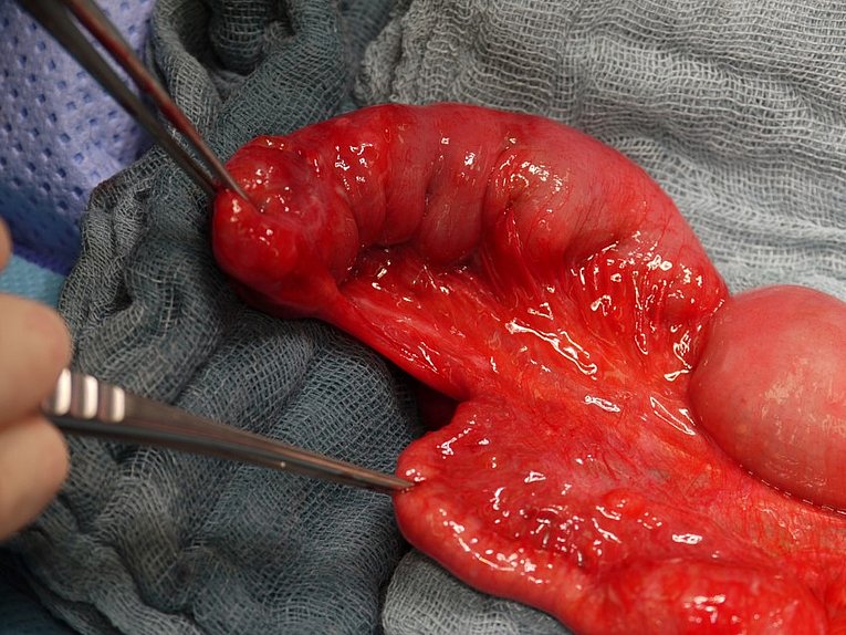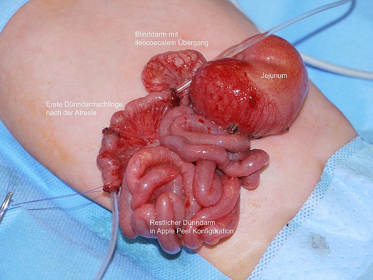 Atresien ist angeborene Abbrüche im Verlauf des Magen-Darm-Trakts. Es kommt zum Aufstau des Nahrungs- und Darmsekrets und ggf. zu einer reduzierten Ausbildung des folgenden, abgeschnittenen Darms. Häufig wird die Anlagestörung schon sonographisch vor der Geburt im Rahmen der Vorsorgeuntersuchungen festgestellt. Nach der Geburt sind dann der Transport der Nahrung und die normale Ausscheidung nicht möglich: es kann zum häufigen Erbrechen kommen und der Mekoniumabgang bleibt aus. Es gibt verschiedene Formen: der Verschluss des Lumens kann durch ein Web (Schleimhautfalte) verursacht sein, kann vollständig auftreten oder auch das Mesenterium, die Aufhängung und Gefäßversorgung des Darms, betreffen. In manchen Fällen zeigt sich nicht nur ein Abbruch, sondern mehrere Atresien. Eine schwerwiegende Sonderform ist die Apple-Peel-Atresie, bei der sich in sehr kurzem Abstand zum Magen eine Atresie ausbildet, die die restliche Gefäßversorgung und Anordnung des Darms verändert, wie auf dem Foto gezeigt. Symptomatik und Therapie unterscheiden sich hierbei aber kaum.